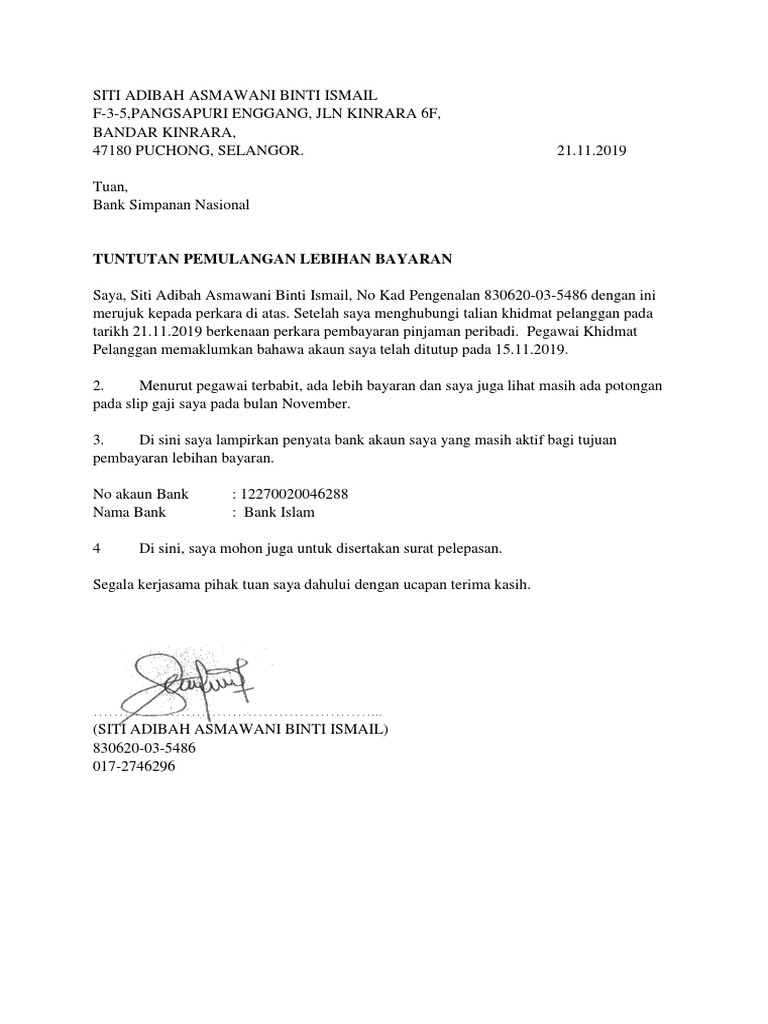 Surat Rasmi Tuntutan Lebihan Bayaran