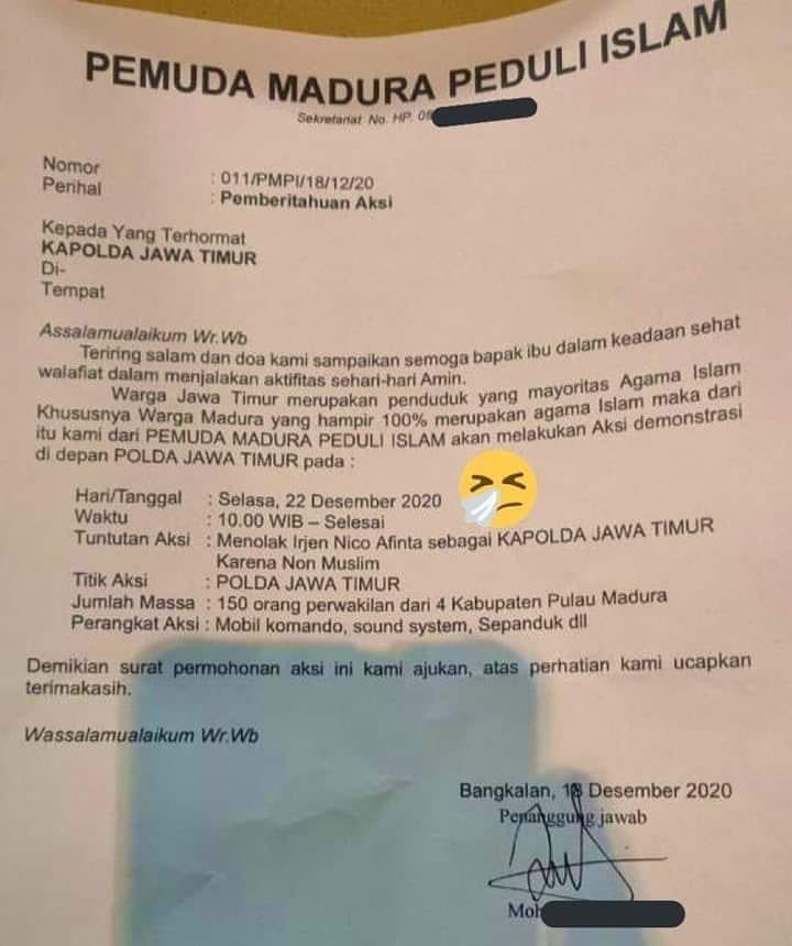 Beredar Surat Pemberitahuan Aksi Penolakan Kapolda Jatim Karena Non Muslim