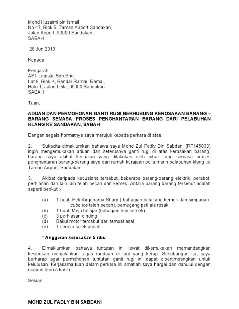 Bahasa Melayu Contoh Surat Tuntutan Ganti Rugi Kerosakan